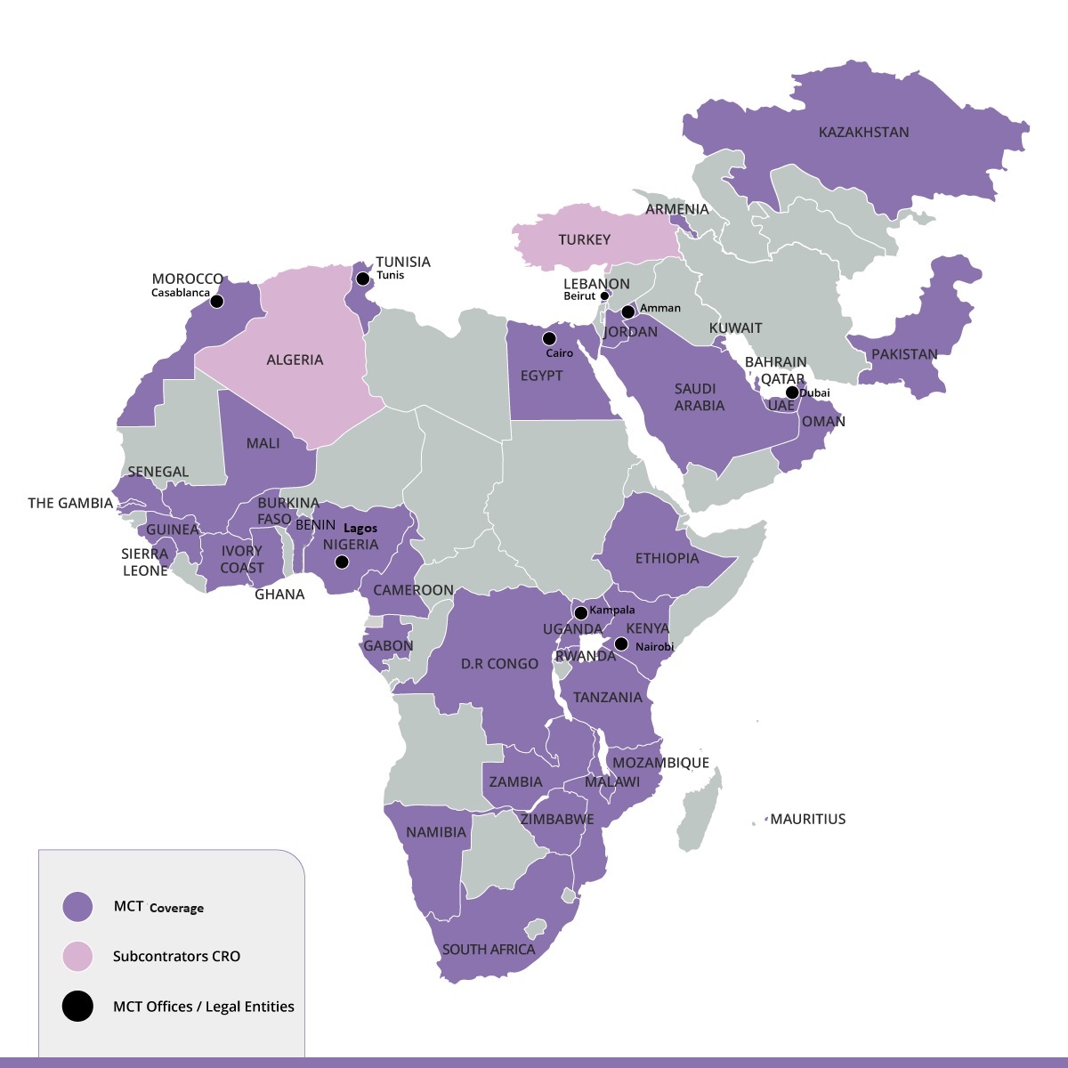 MCT provides extensive clinical trials operations across Africa, the Middle East, Pakistan, and EAEU countries.
